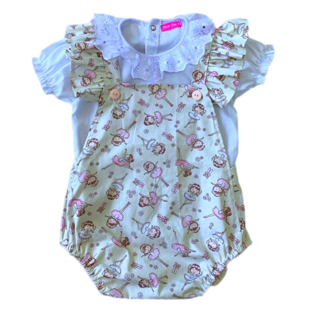Body Jardineira Bailarina Confeccionado com tecido 100% Algodão de altíssima qualidade, com estampa florida, alça cruzada nas costas, possui botão de pressão na parte de baixo para abertura/fechamento. Possui 2 peças, sendo Jardineira e blusinha branca. As manguinhas da blusa possuem elásticos nas mangas para dar mais charme para o lookinho.