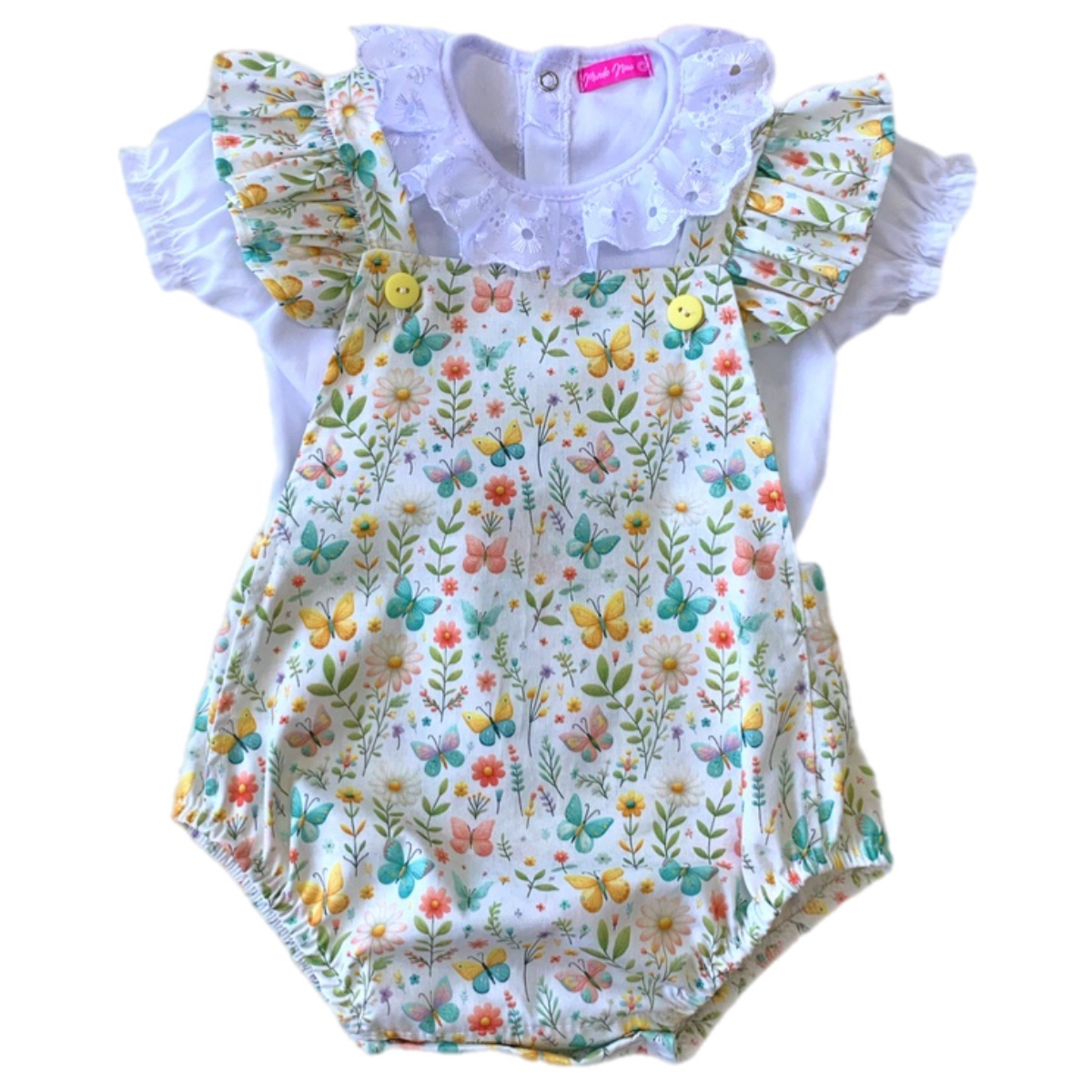 Body Jardineira Melissa Confeccionado com tecido 100% Algodão de altíssima qualidade, com estampa, alça cruzada nas costas, possui botão de pressão na parte de baixo para abertura/fechamento. Possui 2 peças, sendo Jardineira e blusinha branco. As manguinhas da blusa possuem elásticos nas mangas para dar mais charme para o lookinho.