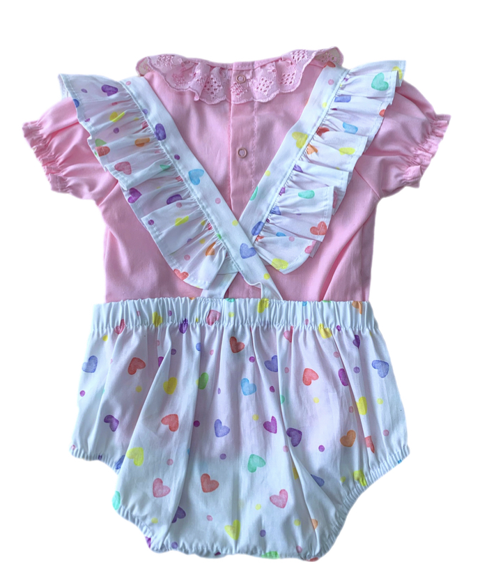 Body Jardineira Rebeca Confeccionado com tecido 100% Algodão de altíssima qualidade, com estampa de coração, alça cruzada nas costas, possui botão de pressão na parte de baixo para abertura/fechamento. Possui 2 peças, sendo Jardineira e blusinha Rosa. As manguinhas da blusa possuem elásticos nas mangas para dar mais charme para o lookinho.