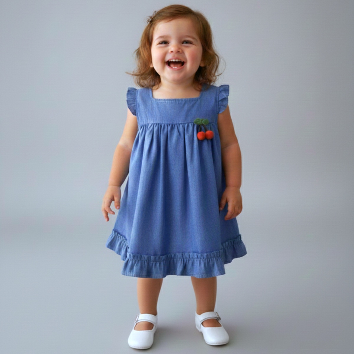 Confeccionado em tricoline premium 100% algodão, este vestido infantil une qualidade têxtil superior a um design atemporal. O tecido possui estampa com efeito denim (jeanswear inspired), desenvolvida para reproduzir a estética do jeans com a leveza, maciez e respirabilidade do algodão, garantindo conforto absoluto para o uso infantil.